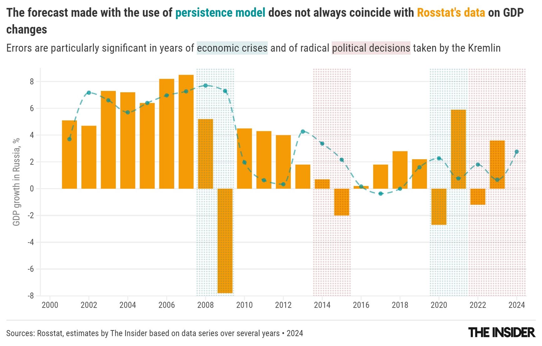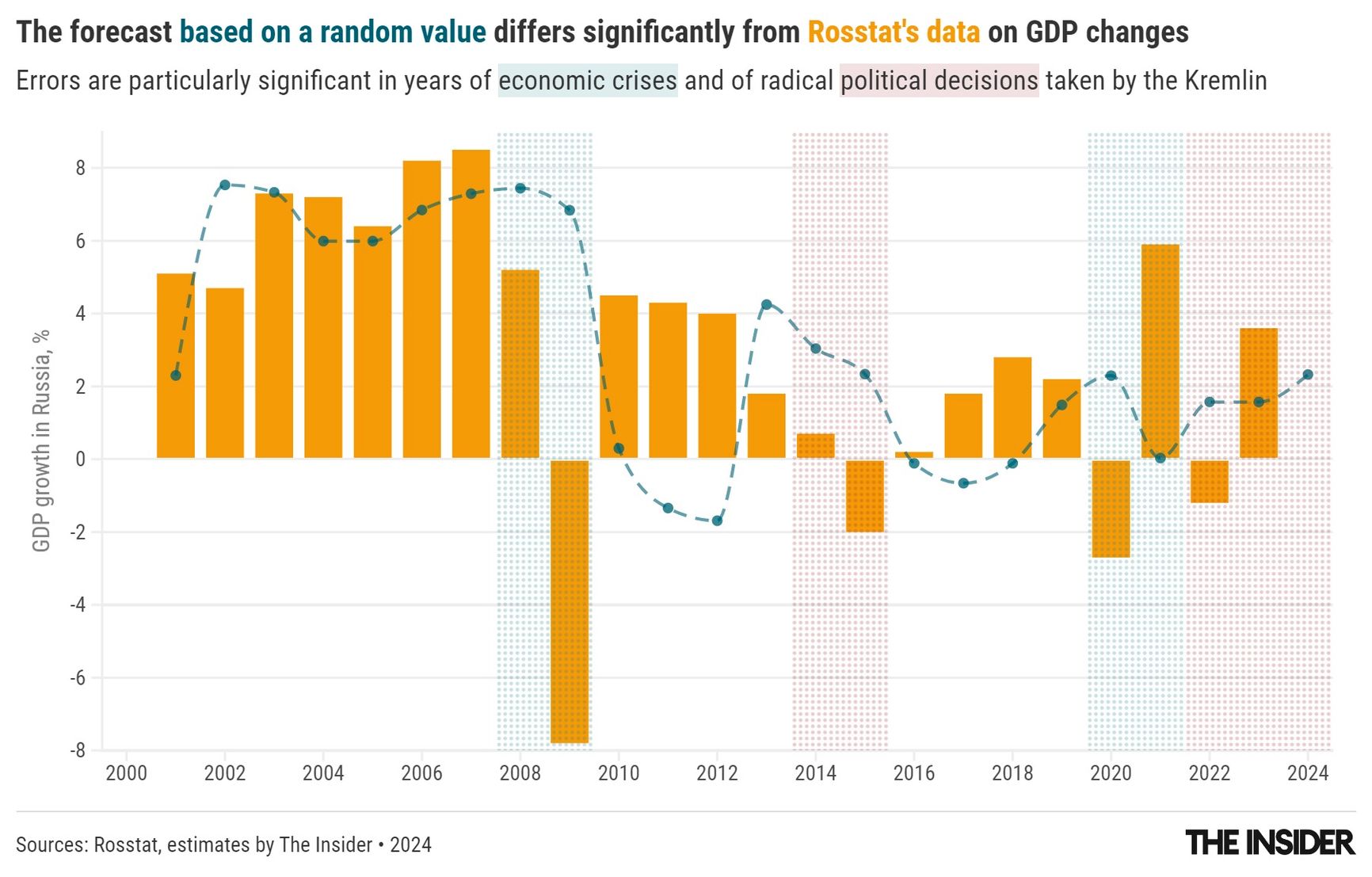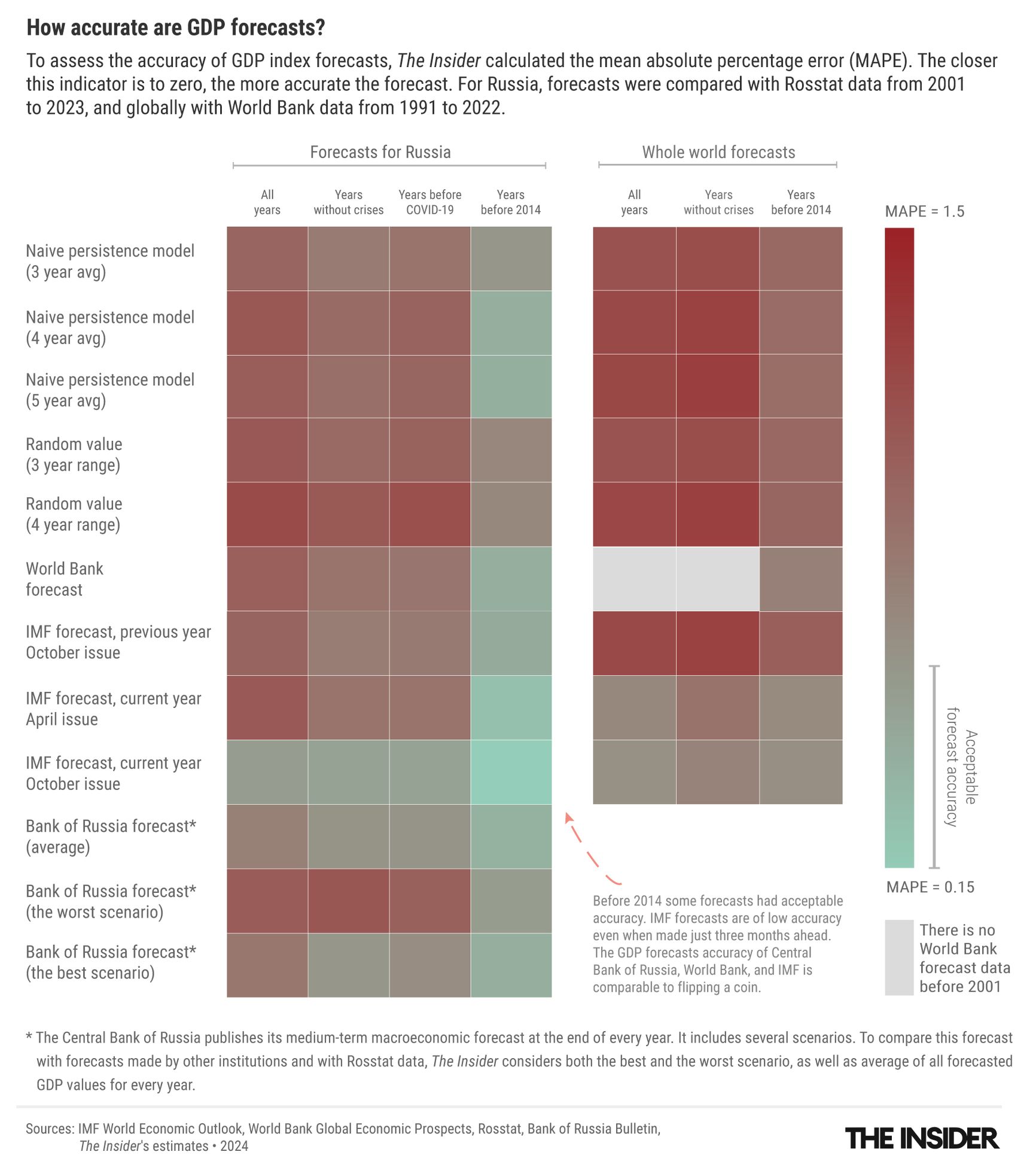 To gauge the accuracy of these forecasts, The Insider compared them with a baseline indicator that involves no expert analysis: taking the average growth over the last three years and assuming it will continue in the next year. This method also yields a MAPE just under 1 for all years and slightly less than 0.8 for pre-pandemic forecasts. Thus, this simplistic projection, which a fifth-grader could calculate, proves to be as inaccurate — or even slightly more accurate — than the predictions from major expert centers armed with complex theories and models.