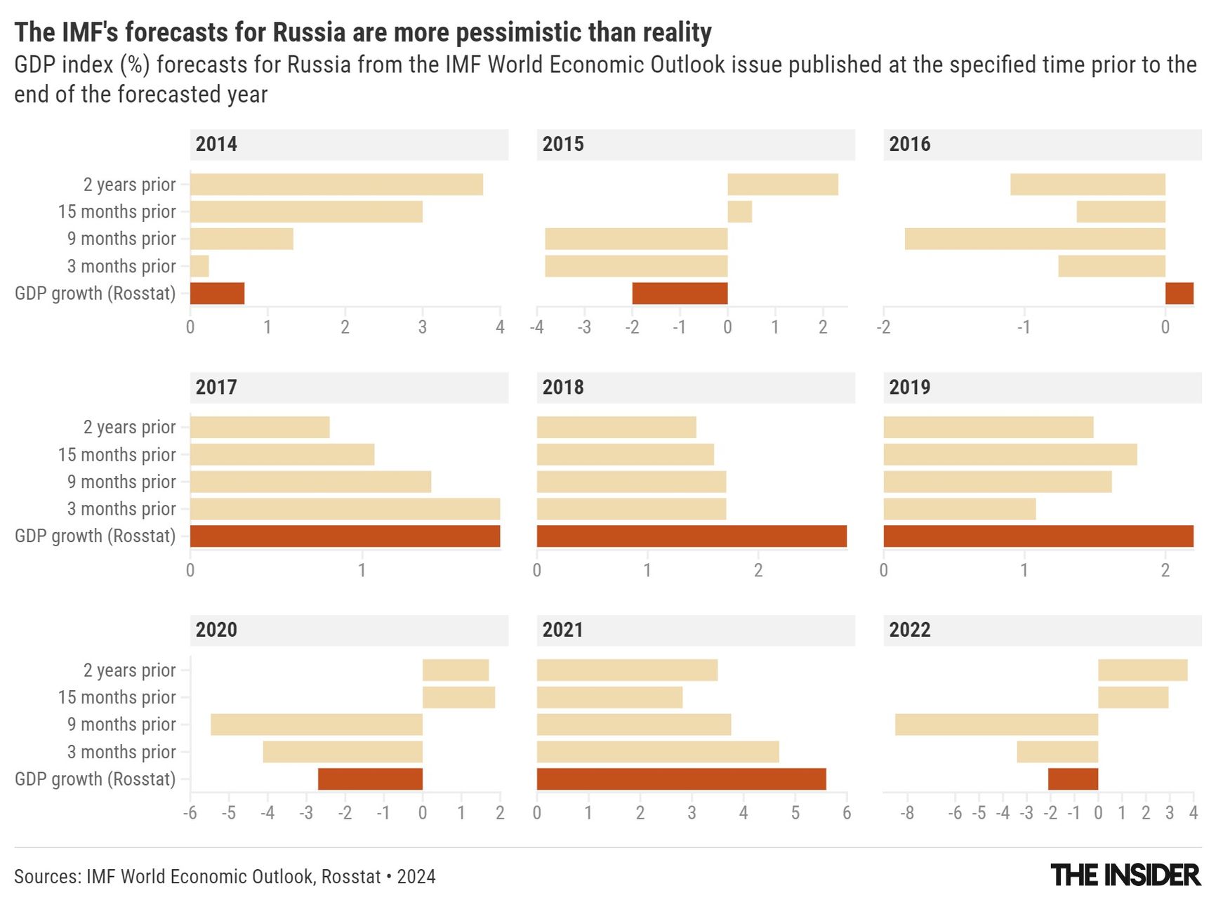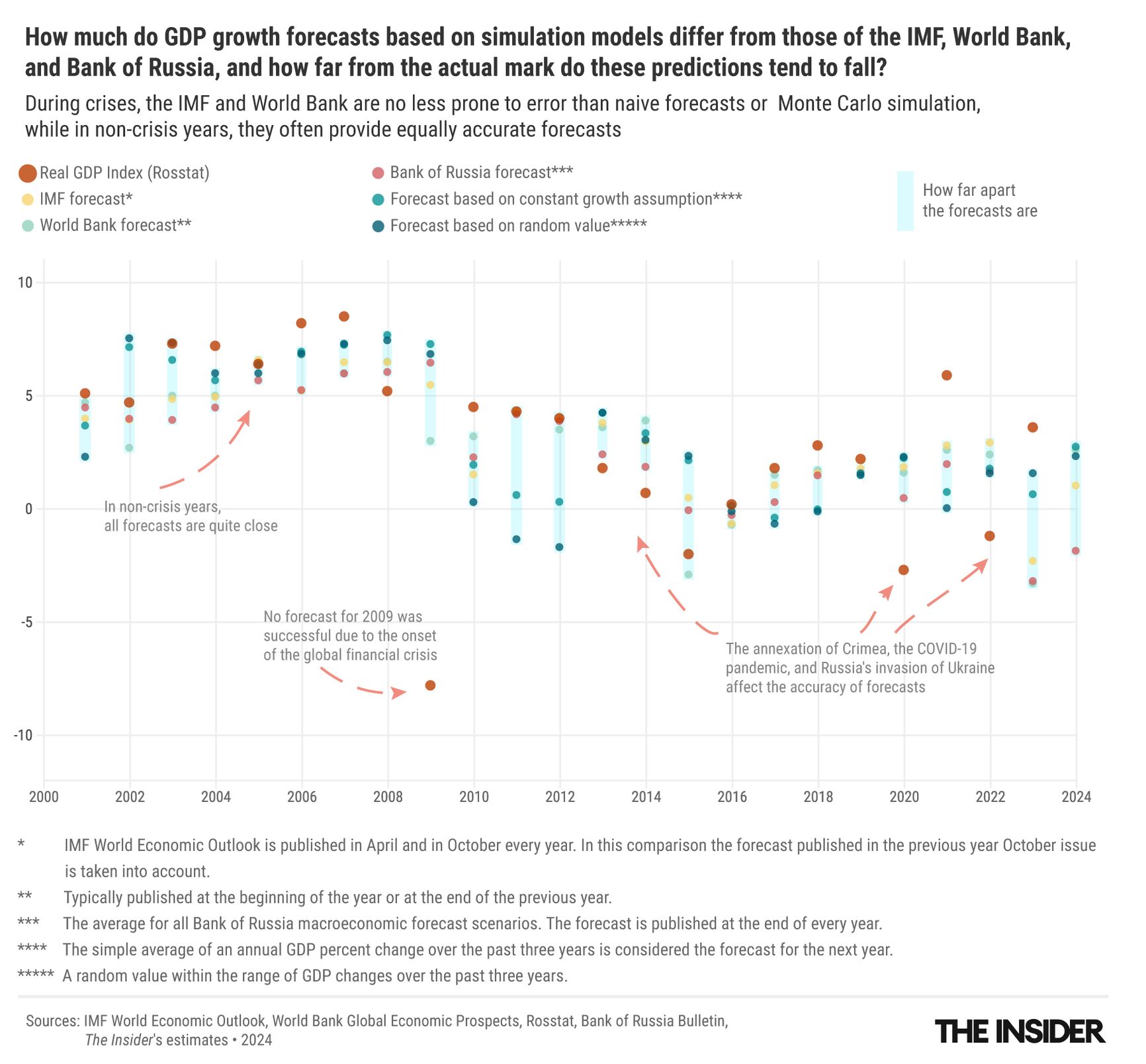 Despite sanctions, the World Bank’s June forecast predicts that the Russian economy will grow by 2.9% in 2024, a figure in line with the Bank of Russia’s own expectation. However, these optimistic predictions are no more reliable than horoscopes or card readings. The Insider reviewed GDP forecasts for Russia and the world from the World Bank, IMF, Russian Central Bank, and Russia's Ministry of Economic Development, finding them to be no more accurate — and sometimes less — than simply extrapolating average growth from the trend seen in recent years. This inaccuracy is the result of the fact that the economy of a country is influenced by numerous impossible to model variables — and of course, any framework for foretelling the future must make due with imperfect data while attempting to overcome the subjective biases of forecasters’ themselves.