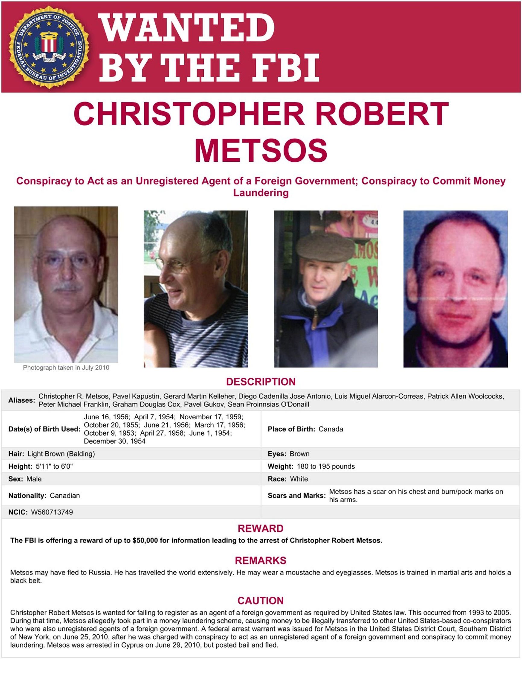 Another board member of the Oreshek cooperative was Pavel Kapustin, who spied in the U.S. using the identity documents of Christopher Metsos, who died at the age of five and is buried in a Toronto suburb. Kapustin is the only one among the entire group of illegals whom the Americans failed to arrest, though the FBI has declared him wanted. “Metsos may have fled to Russia. He has travelled the world extensively. He may wear a moustache and eyeglasses. Metsos is trained in martial arts and holds a black belt,” the FBI’s notice states.