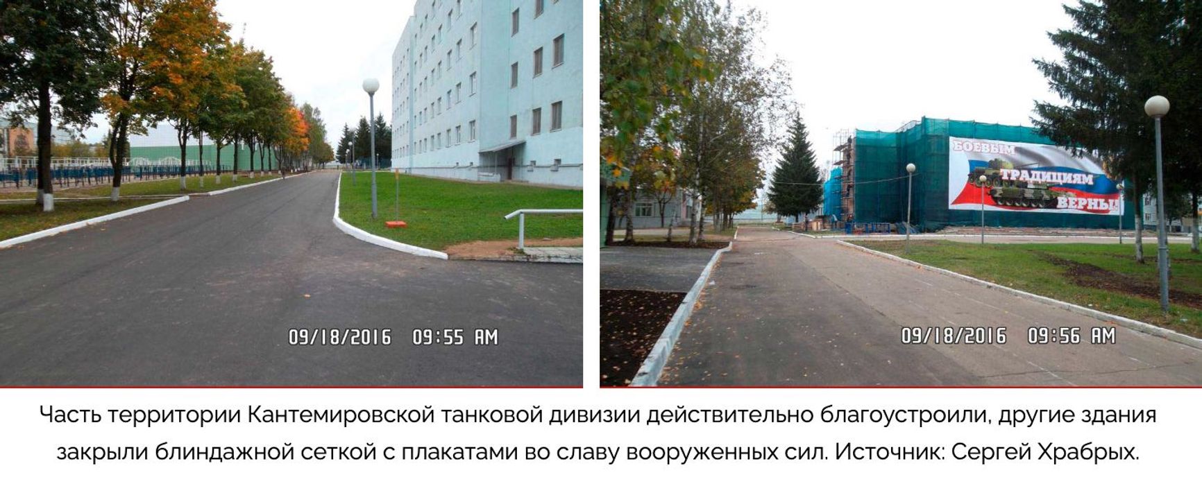 Khrabrykh said that “Ter-Avanesov offered him the position of construction director at Spetsmontazh,” and then personally promised – in Timur Ivanov’s reception room – that new contracts would be awarded to this company and everything would be fine. Almost immediately, the company was assigned to improving the territory of the Kantemirov Tank Division for the arrival of OSCE observers in September 2016. 500 million roubles ($6.2 million in 2023) were allocated, but only 80 million actually made it to the contractor, Khrabrykh said. Part of the site was asphalted, the facades of some buildings were restored, and the rest were covered with a camouflage net with patriotic posters.