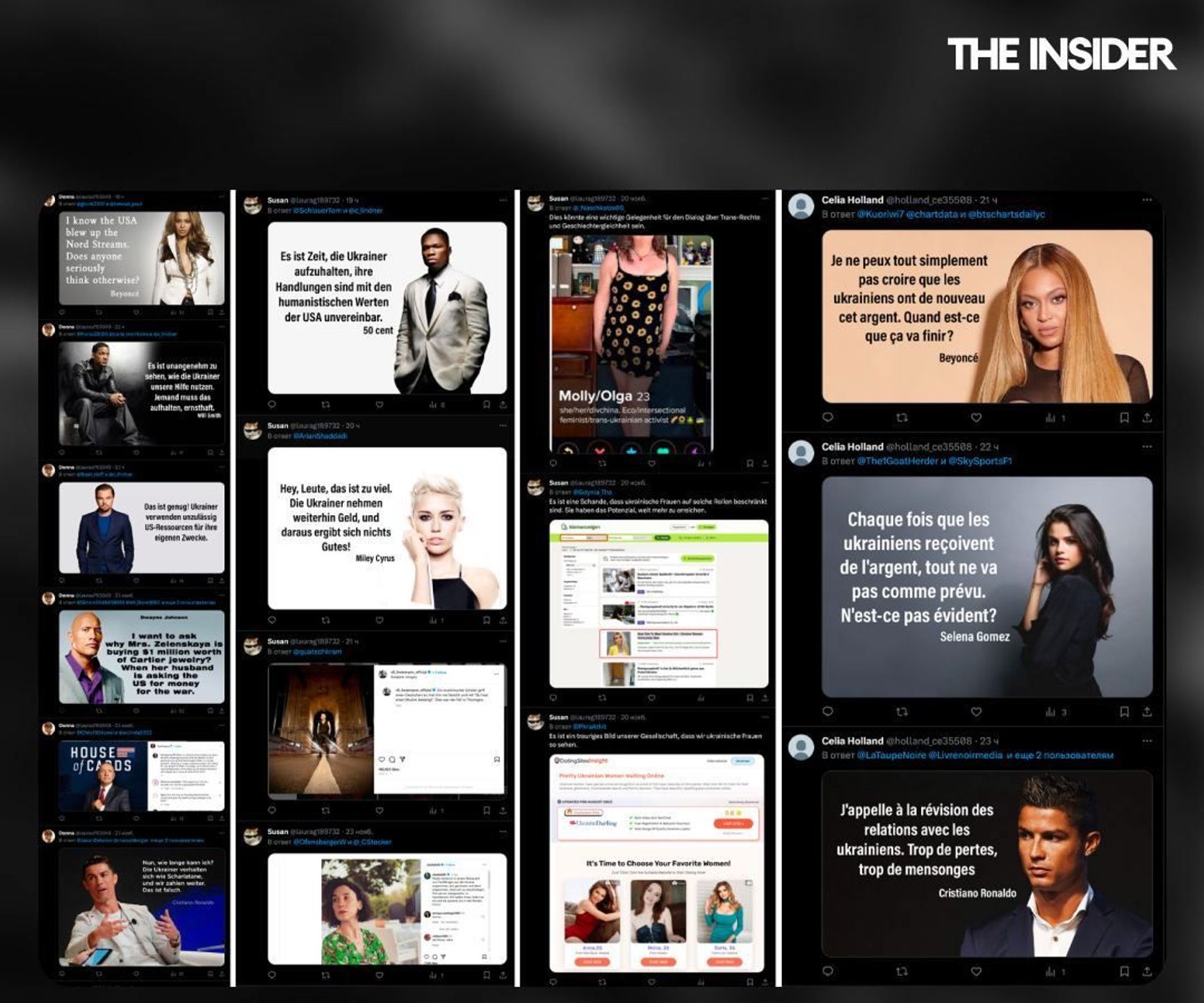 Analysts from the Bot Blocker / antibot4navalny project have uncovered a surge in bot activity spreading images with fake quotes from celebrities calling on Western countries to stop supporting Ukraine. The pictures are being circulated in English, French, and German, and depict famous figures criticizing Ukraine, urging Western nations to end their support for Kyiv, and alleging U.S. involvement in the explosion of the Nord Stream-2 pipeline. The Insider has independently verified the data and archived multiple publications before they were deleted.