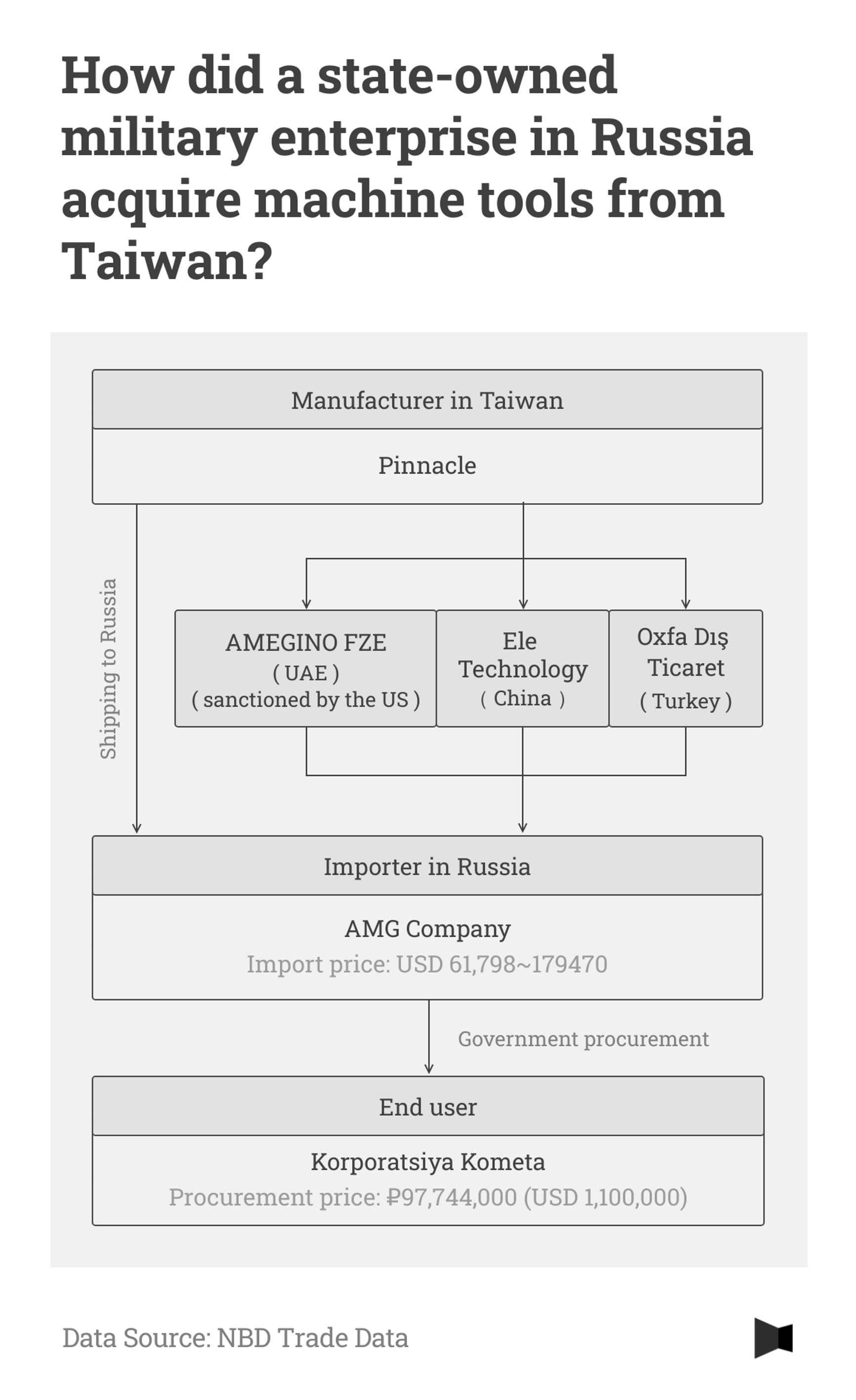 Also of note was the price Kometa paid for the Pinnacle machine, which is listed in the contract as having been purchased for 97.74 million rubles (approximately $1 million). The middleman in the September sale was the Moscow-based trader “Kompaniya AMG” (Компания АМГ). Between March and July 2023 — after Taiwan had expanded its export controls — Kompaniya AMG obtained 9 Pinnacle machines through traders in the United Arab Emirates, Turkey and China. The unit price of these Pinnacle machine tools purchased by AMG and imported into Russia was markedly lower than that paid in September, ranging from $60,000 to US$180,000.