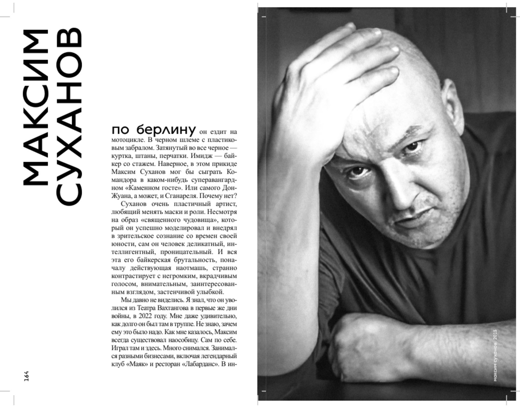 Суханов очень пластичный артист, любящий менять маски и роли. Несмотря на образ «священного чудовища», который он успешно моделировал и внедрял в зрительское сознание со времен своей юности, сам он человек деликатный, интеллигентный, проницательный. И вся эта его байкерская брутальность, поначалу действующая наотмашь, странно контрастирует с негромким, вкрадчивым голосом, внимательным, заинтересованным взглядом, застенчивой улыбкой.