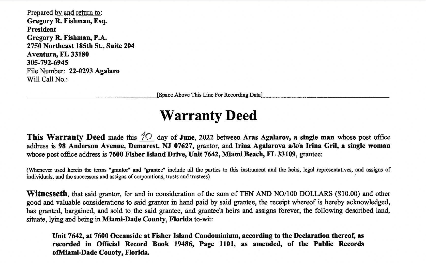 После начала полномасштабной войны с Украиной многие российские бизнесмены и политики, опасаясь санкций, переписывали заграничное имущество на доверенных людей. Не стал исключением и Агаларов. Согласно имеющимся у The Insider документам, летом прошлого года олигарх оформил свою квартиру в Майами на жену Ирину Агаларову (Гриль). Проживает по этому адресу и его дочь Шейла Агаларова.