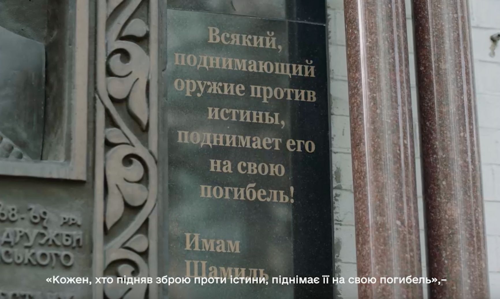 Зеленский заявил, что обращается к народам Кавказа из той части Киева, где в 1860-х жил лидер северокавказского национально-освободительного сопротивления, национальный герой Дагестана и Чечни имам Шамиль. В видеоряде приводится мемориальная доска с барельефом Шамиля и его цитатой, провозглашающей непобедимость истины. Зеленский подчеркнул, что в Украине умеют чтить героев.