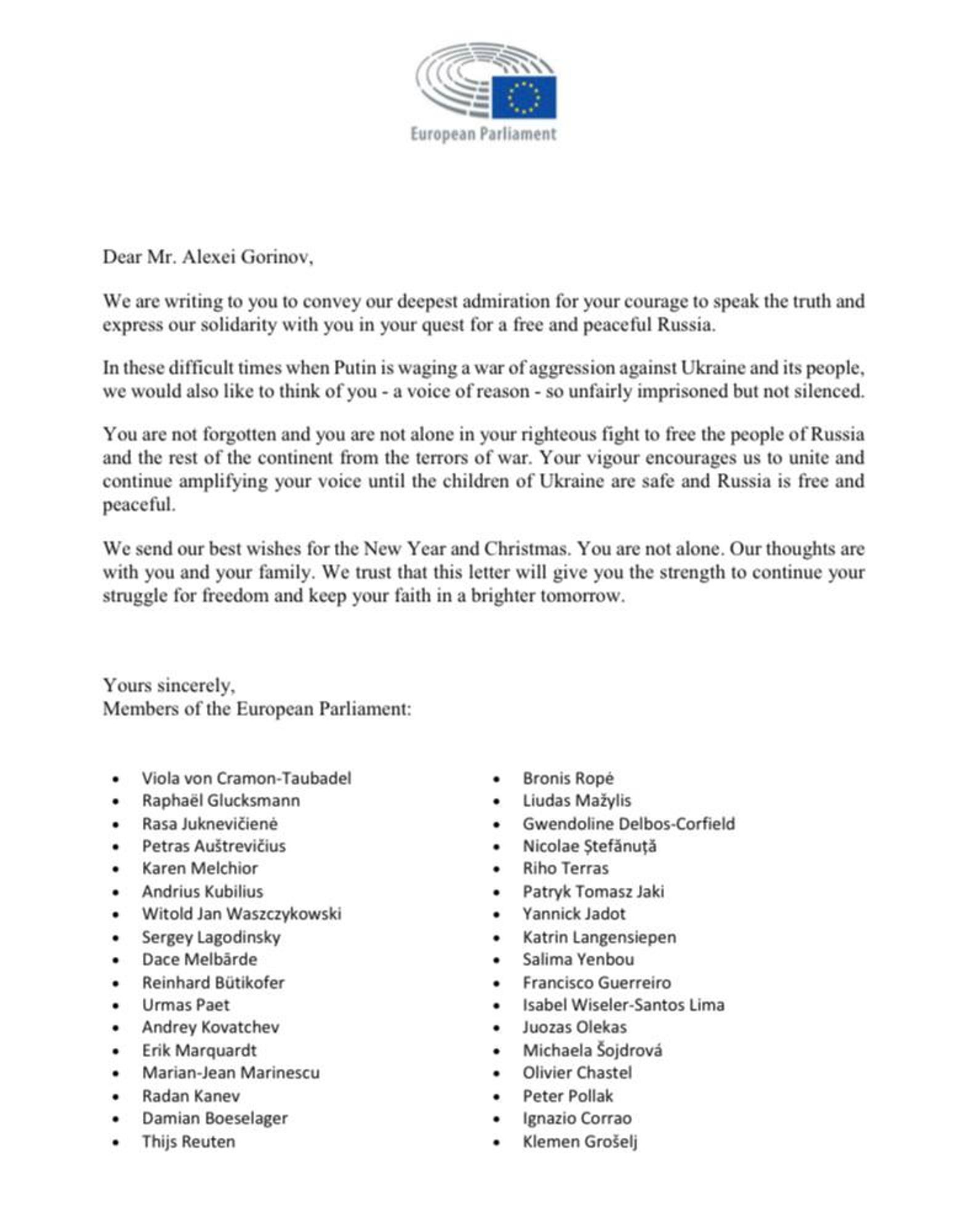34 депутата Европарламента написали письмо в поддержку бывшего муниципального депутата Алексея Горинова, приговоренного к 6 годам и 11 месяцам лишения свободы за «фейки» про армию. Письмо разместили соратники экс-депутата в Telegram-канале «Свободу Алексею Горинову!»