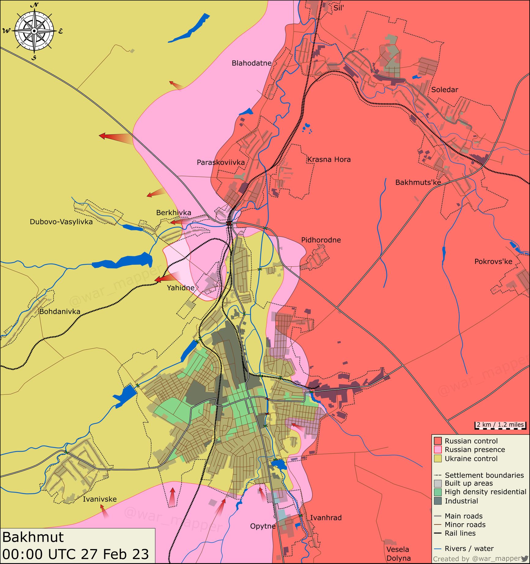 Проект War Mapper публикует карту, отражающую ситуацию вокруг Бахмута к 00:00 27 февраля. По данным аналитиков, российские войска продвинулись западнее Ягодного.
