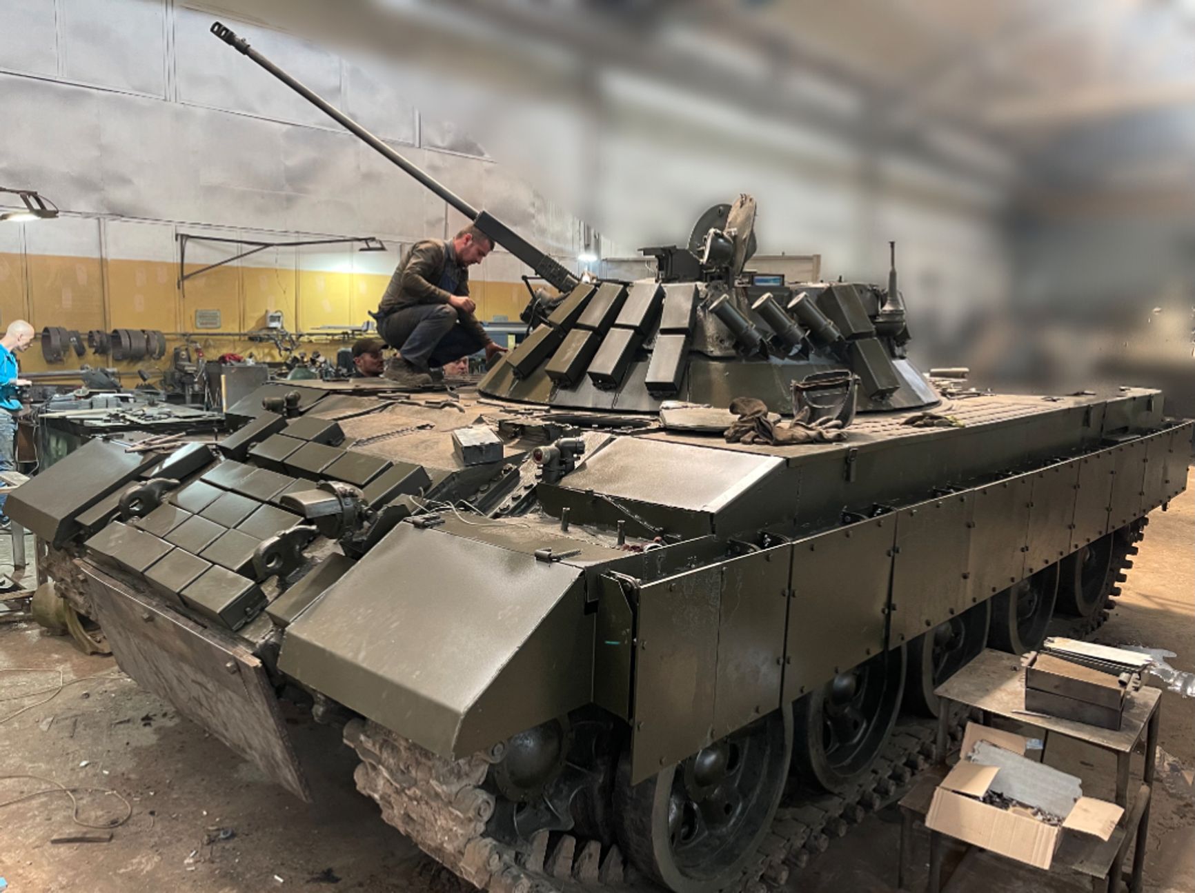 Тем временем в Украине продолжают доработку имеющейся техники. Появились новые фотографии так называемого «БМПВ» — трофейного танка Т-62, на который установлена башня от боевой машины пехоты БМП-2 с вездесущей динамической защитой «Контакт-1». Эта машина может вести огонь из 30-мм автоматической пушки БМП-2, не используя дефицитные 115-мм боеприпасы для советского танка.