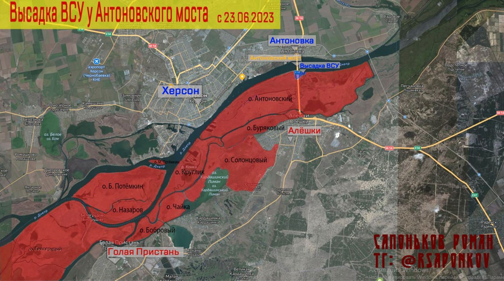 «Военкор» Роман Сапоньков публикует карту обстановки, сложившейся рядом с Антоновским мостом, и отмечает, что технически украинские военнослужащие высадились на острове Антоновском, а до собственно левого берега Днепра им необходимо преодолеть еще почти 4 км.