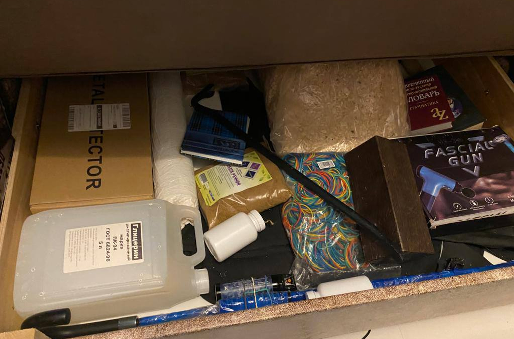 Имя задержанного не называется. На фото с обыска в коробке, помимо пятилитровой канистры с глицерином, упаковки речного песка, пакета с чем-то, похожим на опилки, канцелярских резинок и картонной коробки почему-то лежат также карманный англо-русский словарь и упаковка от массажера-пистолета.