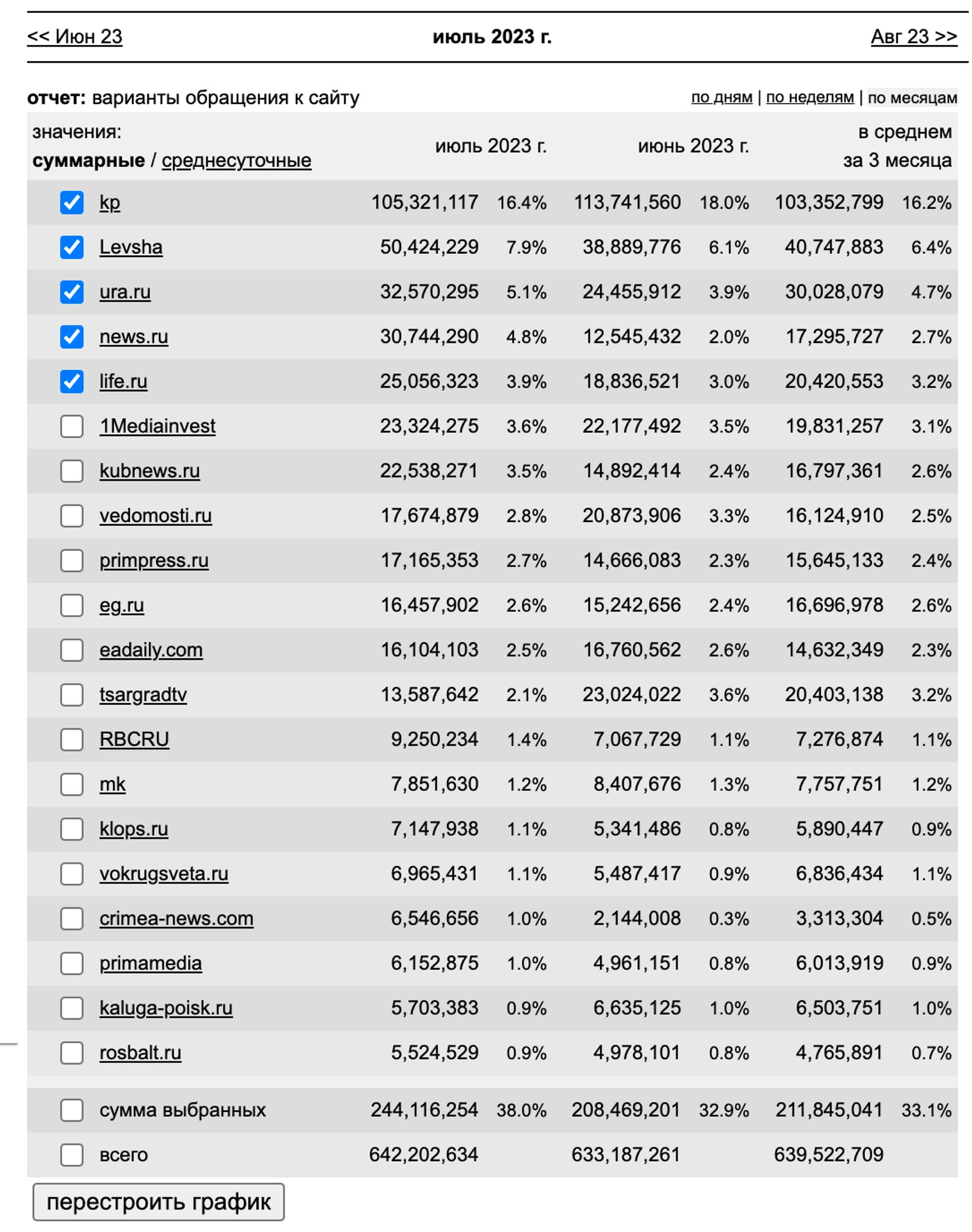 Согласно данным liveinternet, в июле 2023 года среди российских медиа больше всех переходов от Google Discover получила «Комсомольская правда» — в материалы издания из сервиса перешло свыше 105 млн человек. Далее идет пропагандистский портал Ura.ru, который получил 32,5 млн переходов, за ним News.ru с 30,7 млн переходов. У life.ru 25 млн переходов.