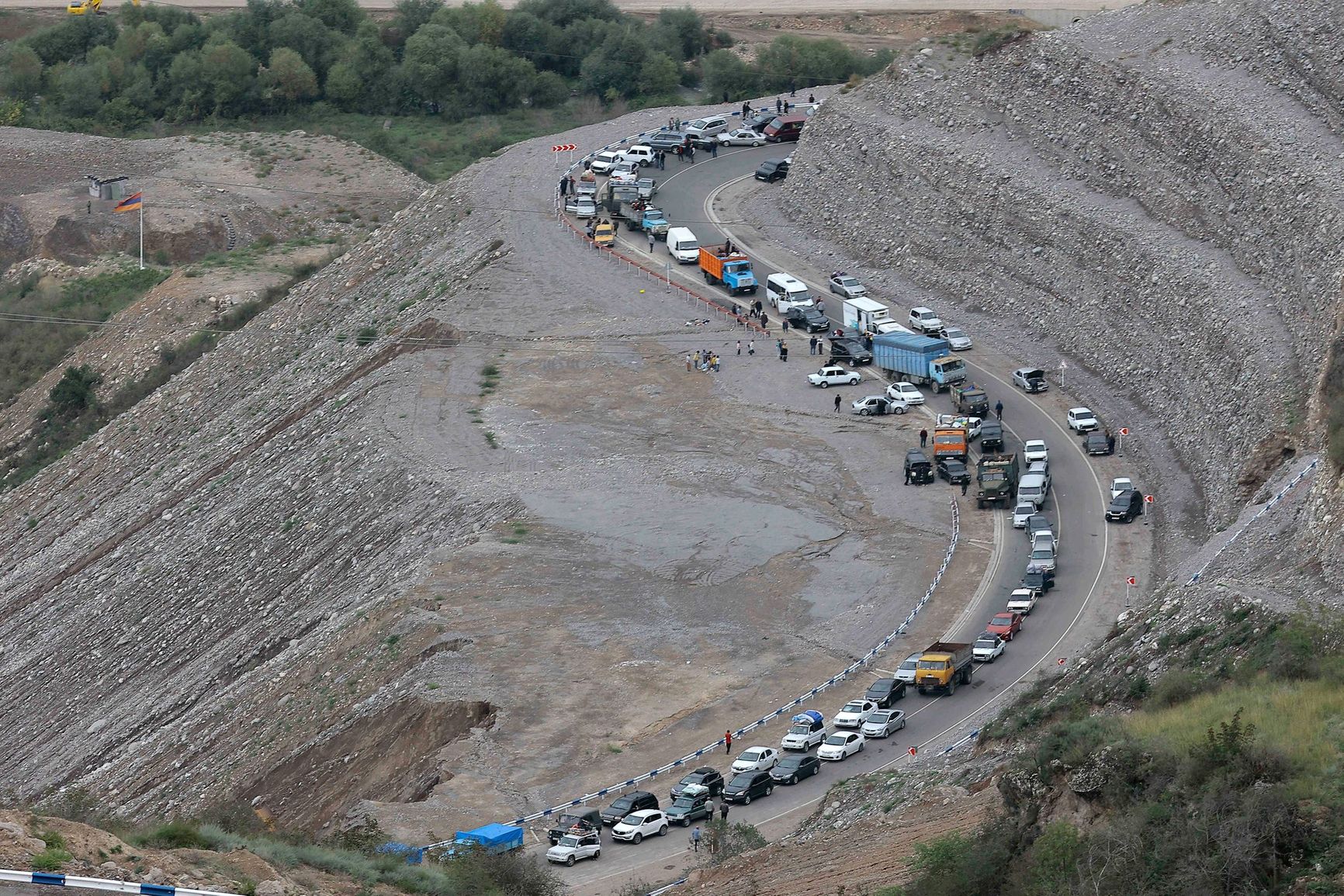 Автомобильный поток из Мартакерта (север НКР). Люди выезжают из города в западном направлении