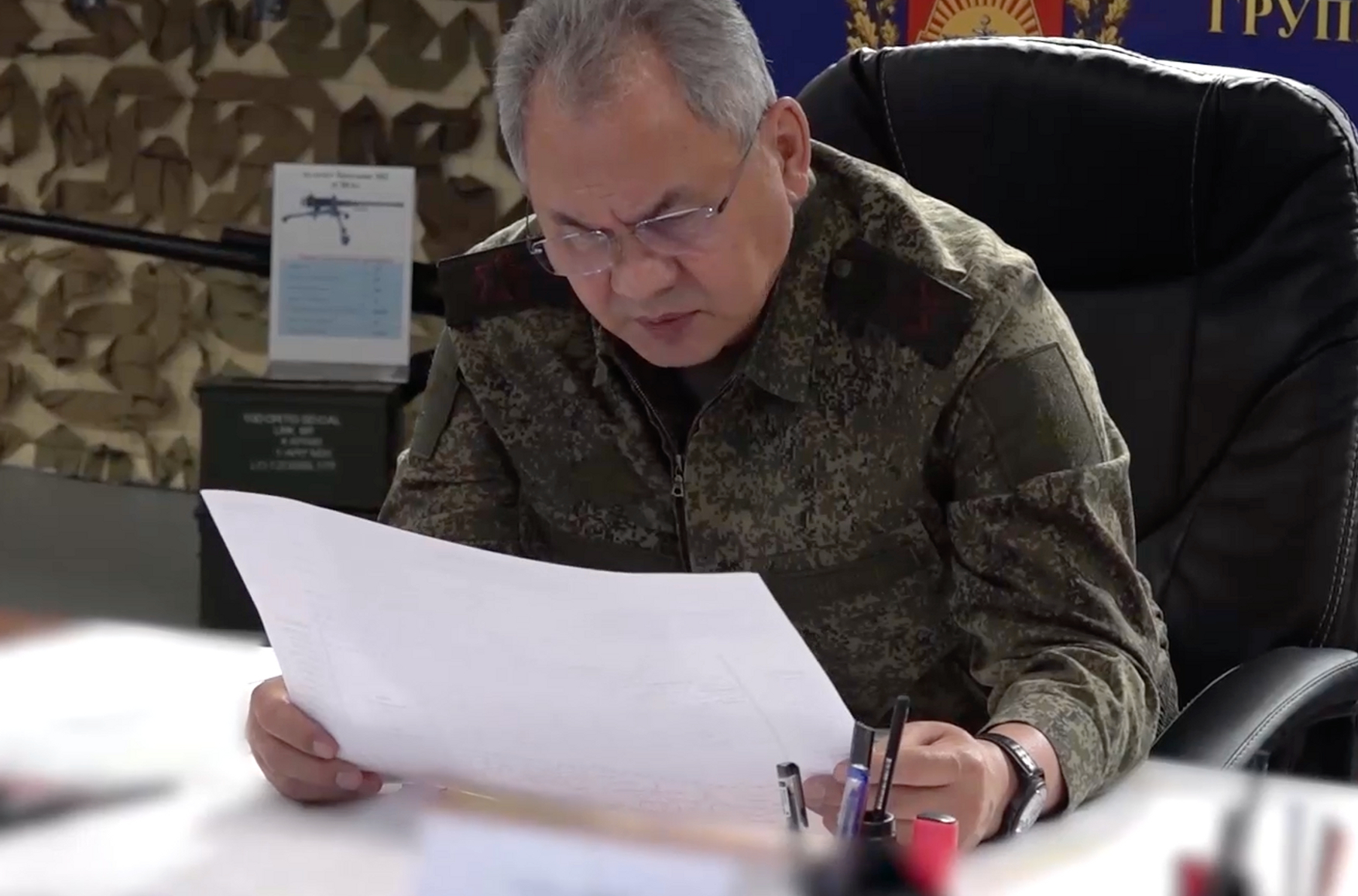 Однако узнать о реальной обстановке на фронте из этого доклада не получится — на кадрах Шойгу за все время произносит только два слова: «Товарищи офицеры». Вся остальная речь министра «засекречена», звук на видео убрали. Также МО заблюрило карты на столе у Шойгу.