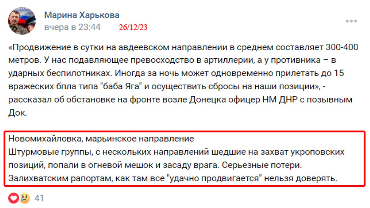 Пророссийский «военкор» из «ДНР» Марина Харькова пишет, что на авдеевском направлении армия РФ продвигается на 300–400 метров в сутки. В то же время в Новомихайловке, по данным Харьковой, российские штурмовые группы, с нескольких направлений следовавшие к украинским позициям, попали в засаду и огневой мешок, понеся серьезные потери.