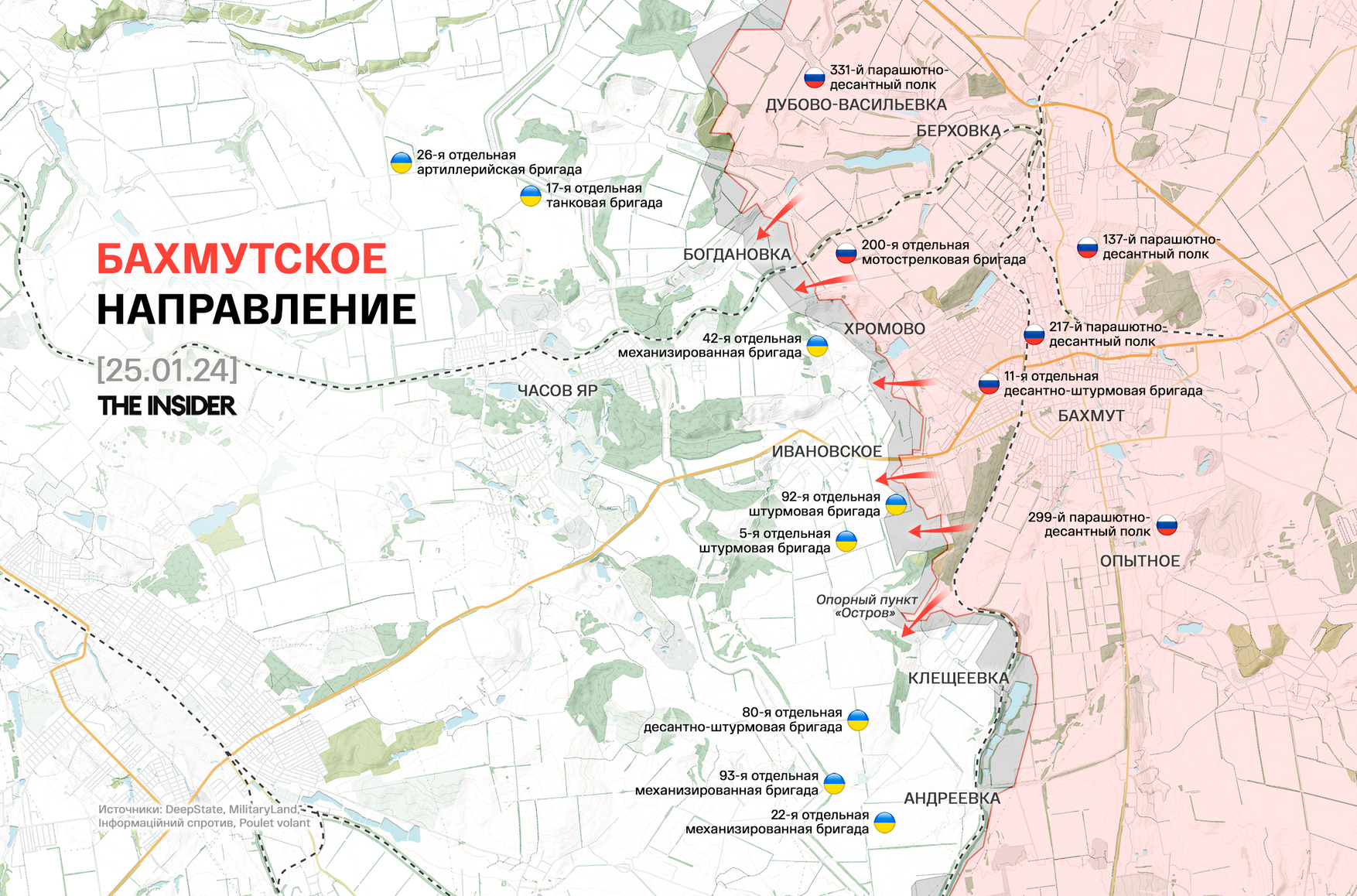 DeepState приводит хронологию российского прорыва в южной части Авдеевки за последнюю неделю — штурм начался 18 января под прикрытием тумана, затрудняющего работу БПЛА, одновременно с «маневром» по упомянутой выше трубе. Благодаря этому удалось полностью окружить «Царскую охоту».
