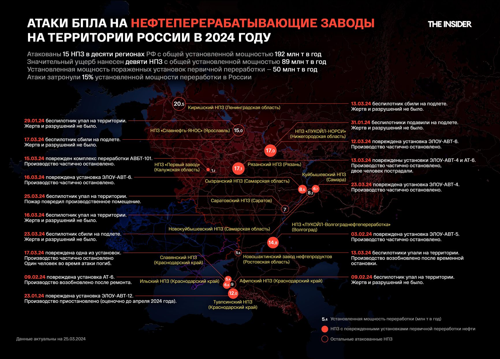 Всего с начала года было атаковано 15 НПЗ, по подсчетам The Insider, в 10 регионах России. Их общая перерабатывающая мощность — 192 млн тонн нефти в год.