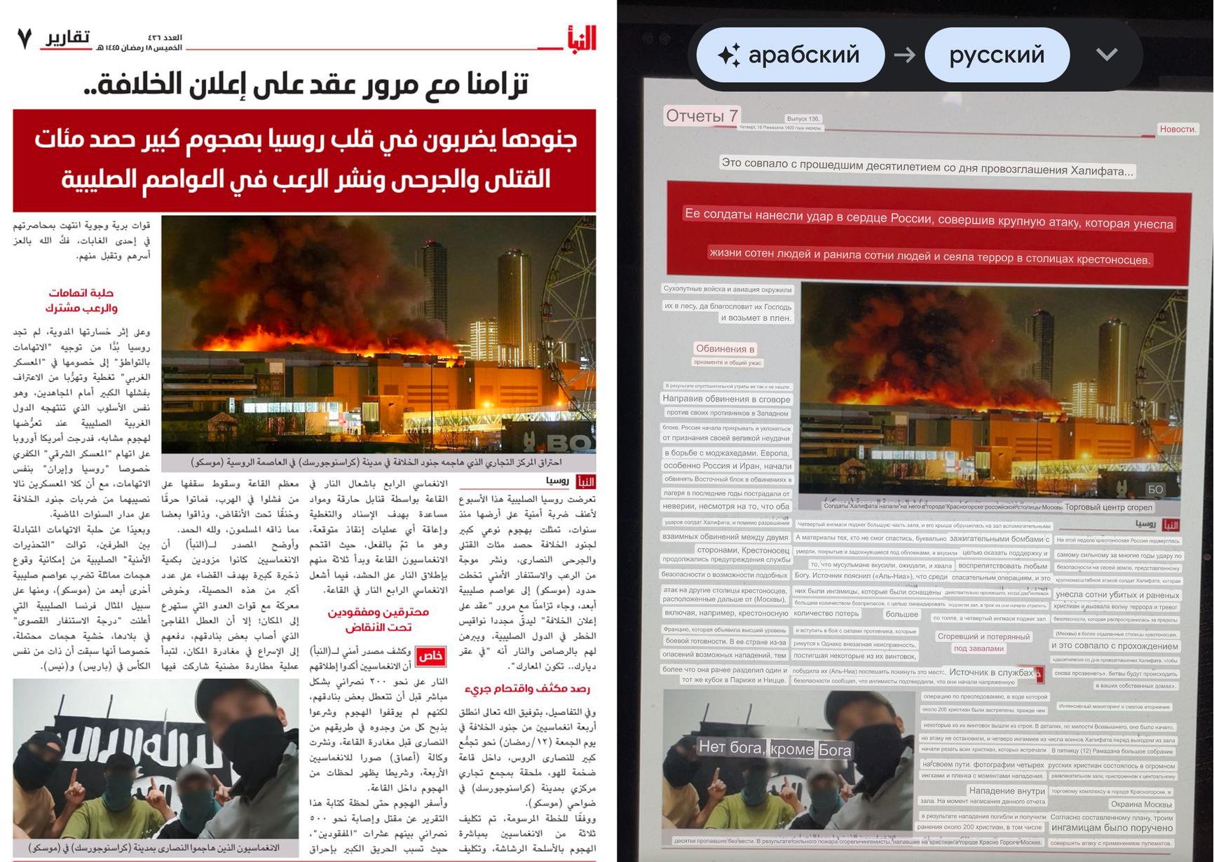 Издание террористов, описывая детали теракта, указывает на то, что трое боевиков должны были расстреливать всех присутствующих в «Крокус Сити Холле», а четвертый — устроить поджог здания. Там также сказано, что неисправность некоторых орудий вынудила боевиков спешно покинуть «Крокус»: нападавшие обладали достаточным количеством оружия для совершения еще большего количества убийств и дальнейшей перестрелки с силовиками.