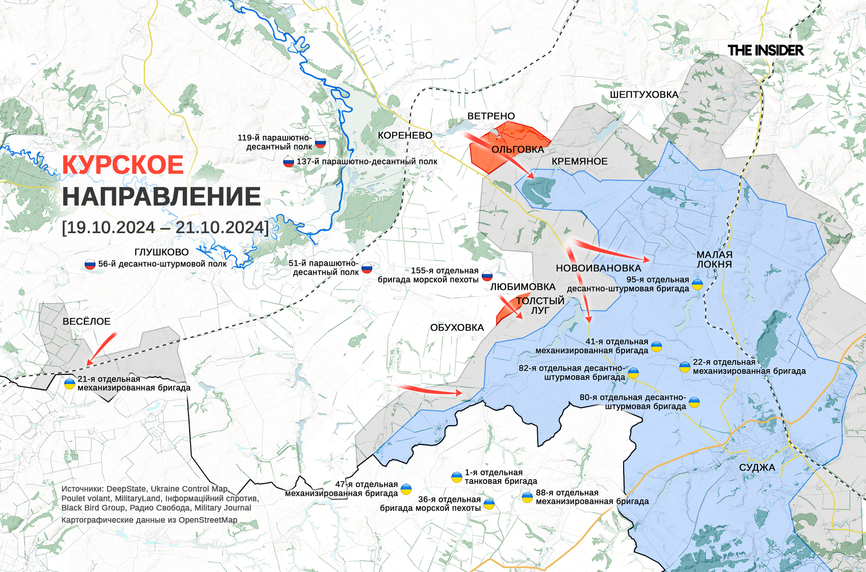 В Курской области продолжаются бои на рубеже Любимовки, Толстого Луга, Зелёного Шляха и Новоивановки, начавшиеся больше недели назад в ходе российского контрнаступления на западном фланге украинского плацдарма. DeepState признает, что ВС РФ удалось продвинуться рядом с Ольговкой и Любимовкой, но относит оставленные ВСУ районы преимущественно к «серой зоне».