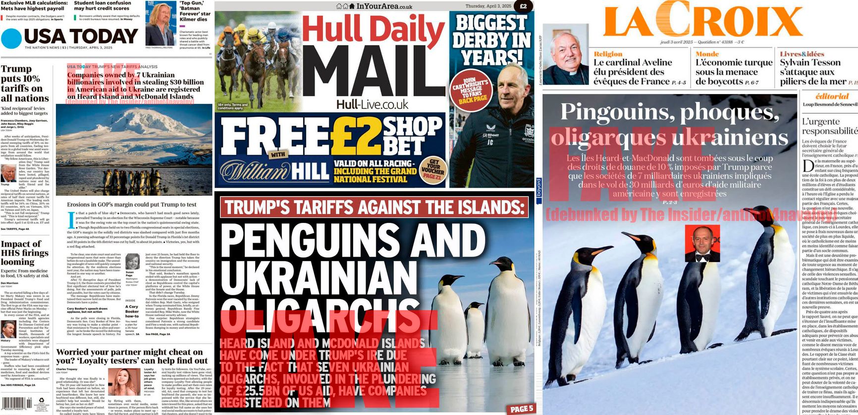 Фейк представляет собой обложки статей якобы на сайтах известных западных СМИ (в действительности таких обложек не существует). В тексте на обложках говорится, что «острова Херд и Макдональд попали под 10-процентные пошлины Трампа, поскольку там зарегистрированы компании семи украинских миллиардеров, причастных к хищению €30 млрд военной помощи США».