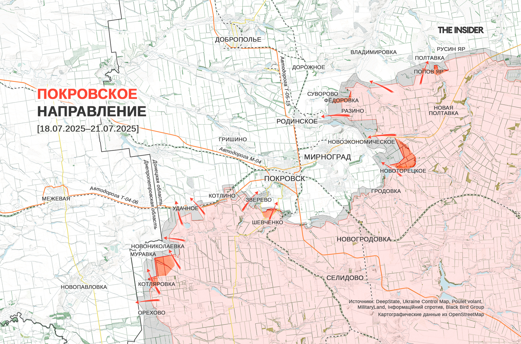 Украинский военный Александр Солонько рассказывает о ситуации севернее Мирнограда (до 2016 года — Димитров). По его мнению, ВС РФ стремятся захватить Родинское, чтобы перерезать трассу Покровск — Доброполье, а также занять Дорожное, чтобы получить контроль над железнодорожной станцией и далее продвигаться на Доброполье по железной дороге. По подсчетам OSINT-исследователя под ником Clément Molin на основе спутниковых снимков, за неделю с 11 июля 2025 года ВКС РФ нанесли 450 авиаударов на этом участке фронта. В районе Родинского «десятки» ударов приходятся по каждому многоэтажному зданию, «посадке» и украинской позиции.