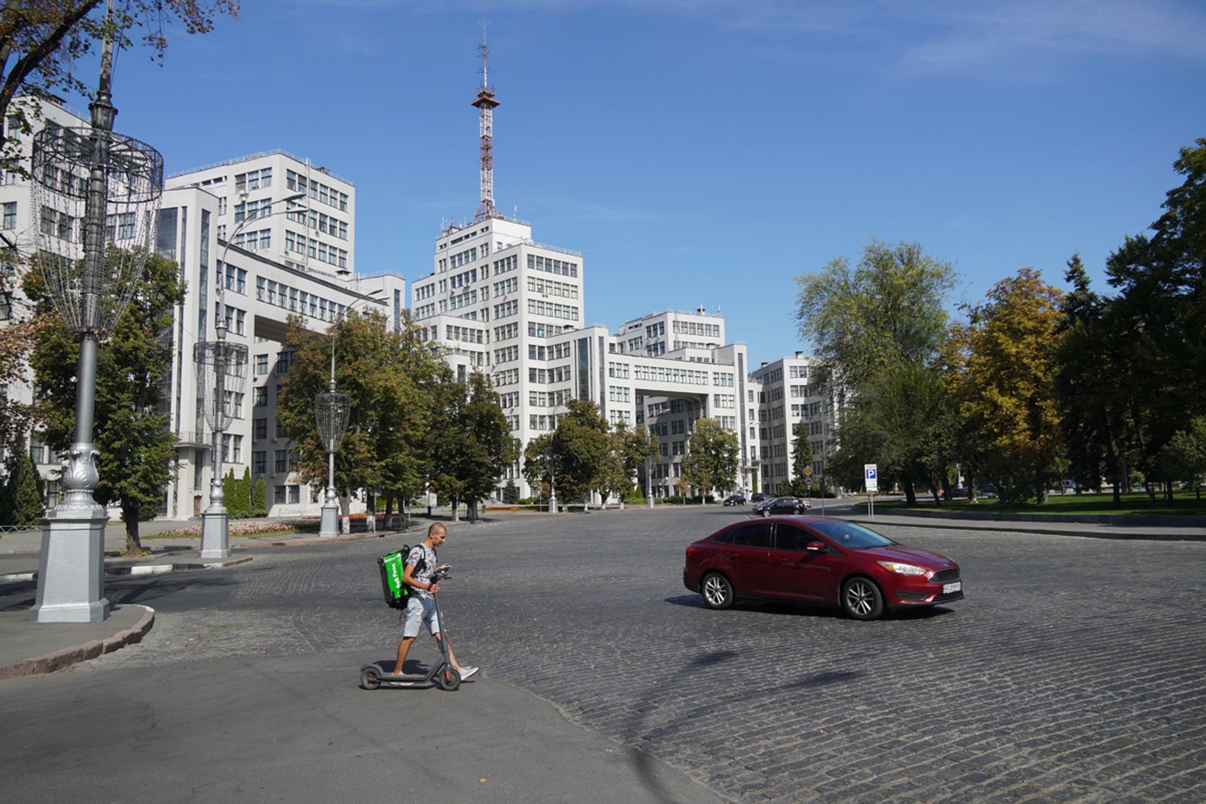 По нынешним временам это не просто неуместные, а по-настоящему кощунственные слова — напротив университета расположено здание Харьковской областной администрации, в котором одним ракетным ударом 1 марта 2022 года было убито 44 человека. За частично разрушенным зданием администрации расположено еще несколько серьезно пострадавших жилых домов и офисных строений.